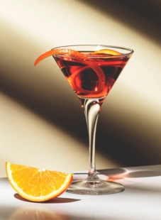 Float grenadine on top and garnish with an orange, lemon and lime slice.